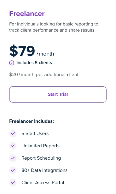 AgencyAnalytics offers three pricing tiers in 2025: Freelancer, Agency, and Agency Pro. While the entry-level price is advertised at $79/month, this comes with a 5-client minimum and limited access to premium features.