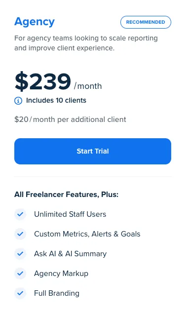 If you're managing just a handful of clients and don’t need advanced features, Agency Analytics might get the job done—just expect upgrade nudges as your client list grows.