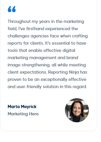 “Throughout my years in the marketing field, I've firsthand experienced the challenges agencies face when crafting reports for clients. It's essential to have tools that enable effective digital marketing management and brand image strengthening, all while meeting client expectations. Reporting Ninja has proven to be an exceptionally effective and user-friendly solution in this regard.”- Marta Meyrick, ‘Marketing Hero’