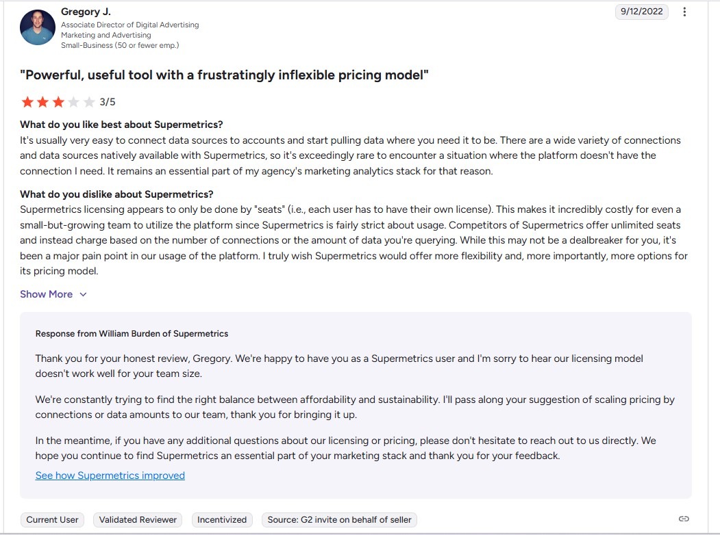 “Supermetrics licensing appears to only be done by ‘seats’ (i.e., each user has to have their own license). This makes it incredibly costly for even a small-but-growing team to utilize the platform since Supermetrics is fairly strict about usage.” - Gregory J., validated G2 reviewer.