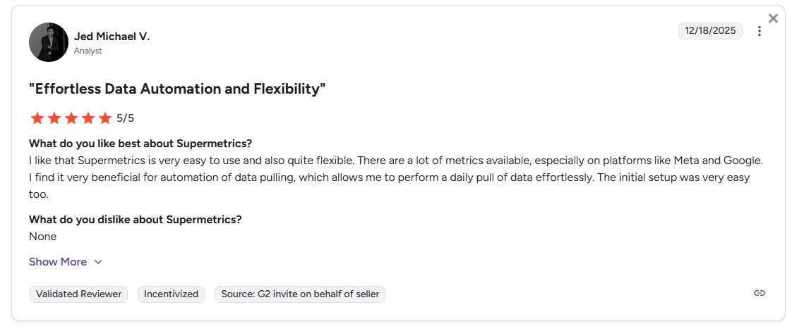 “I like that Supermetrics is very easy to use and also quite flexible. There are a lot of metrics available, especially on platforms like Meta and Google. I find it very beneficial for automation of data pulling, which allows me to perform a daily pull of data effortlessly. The initial setup was very easy too.” - Jed Michael V., validated G2 reviewer.