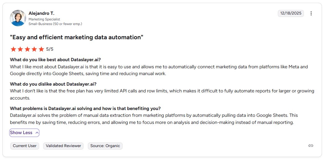 “What I like most about Dataslayer.ai is that it is easy to use and allows me to automatically connect marketing data from platforms like Meta and Google directly into Google Sheets, saving time and reducing manual work.” - Alejandro T., validated G2 reviewer.