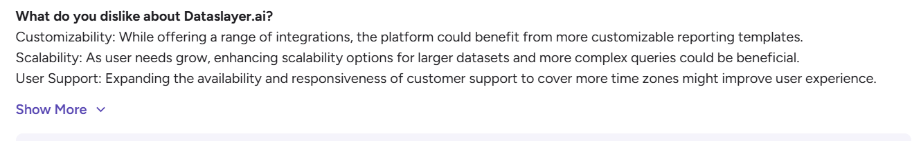 “Customizability: While offering a range of integrations, the platform could benefit from more customizable reporting templates. Scalability: As user needs grow, enhancing scalability options for larger datasets and more complex queries could be beneficial.” - Daniel P., validated G2 reviewer.