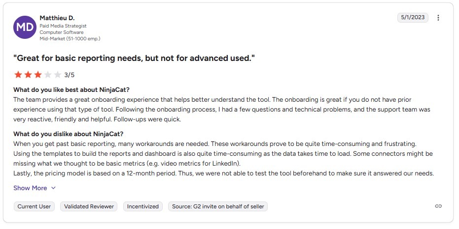 NinjaCat does not publish full pricing publicly. On G2, it’s positioned as custom-priced, which typically means the final cost depends on your agency size, data sources, and reporting scope.