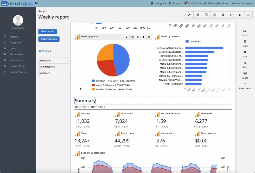 While the platform itself is free, most Facebook Ads connectors (like Windsor.ai or Funnel.io) come with added cost. There are no built-in templates or delivery tools, and setup can be complex. Reporting Ninja, however, offers a solid set of Looker Studio connectors, including one for Facebook Ads. But for marketers who want a flexible, no-subscription reporting tool with live data and cross-channel capabilities, Looker Studio is a strong alternative to paid platforms.