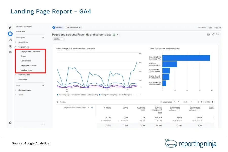 A deeper look at individual pages shows which URLs attract attention and how well they hold it. Useful metrics here include engagement rate, average engagement time, scroll depth, exit rate, and conversions for each page.