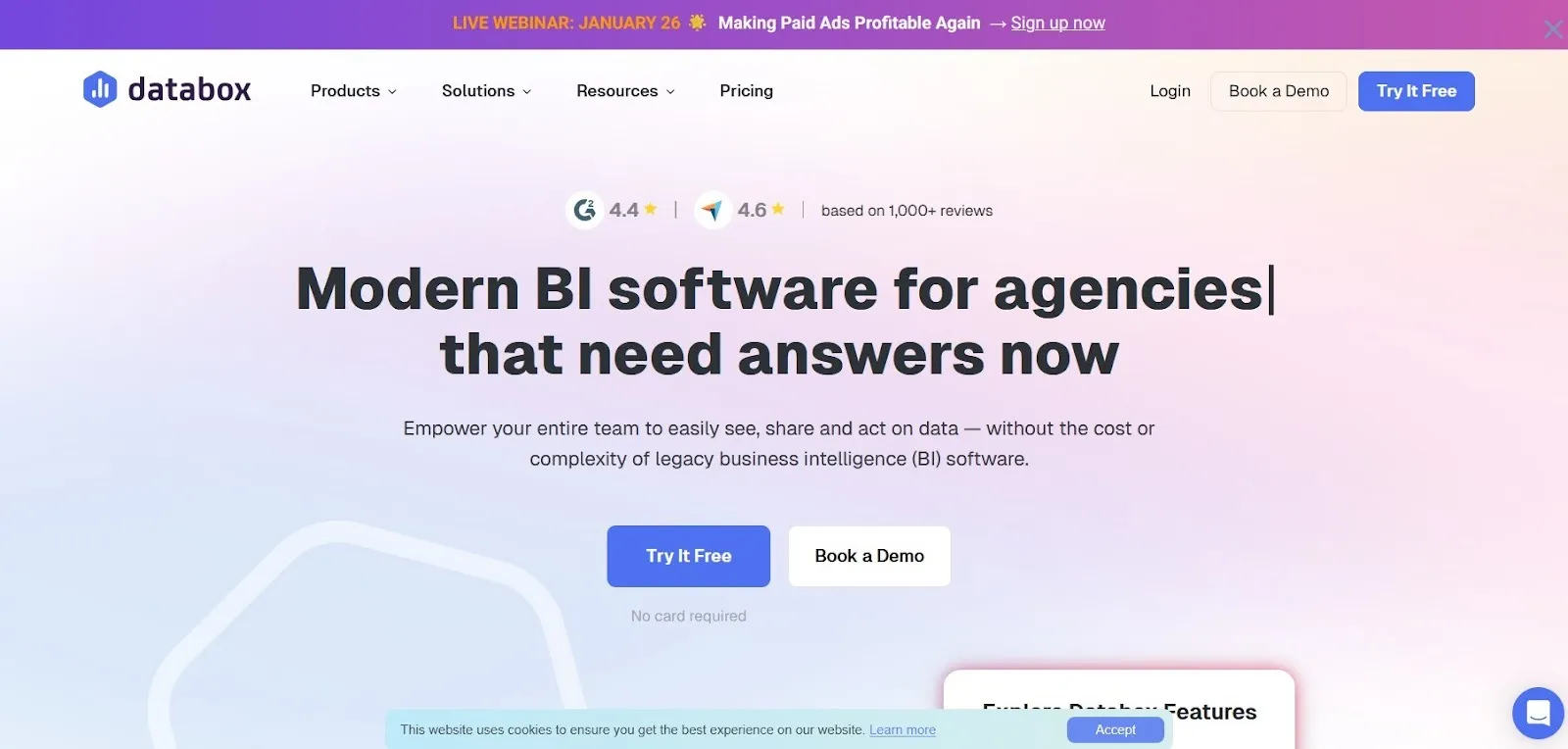 Databox is a decent Looker Studio alternative if your main goal is fast, clean KPI dashboards without spending time on dashboard design or data modeling. It’s built for teams that want reporting to be simple: pick your sources, choose pre-built dashboards, and share results with stakeholders. This makes it a good fit for sales and marketing teams that need visibility into performance, but don’t need deep analytics. Pricing starts from $199/month.