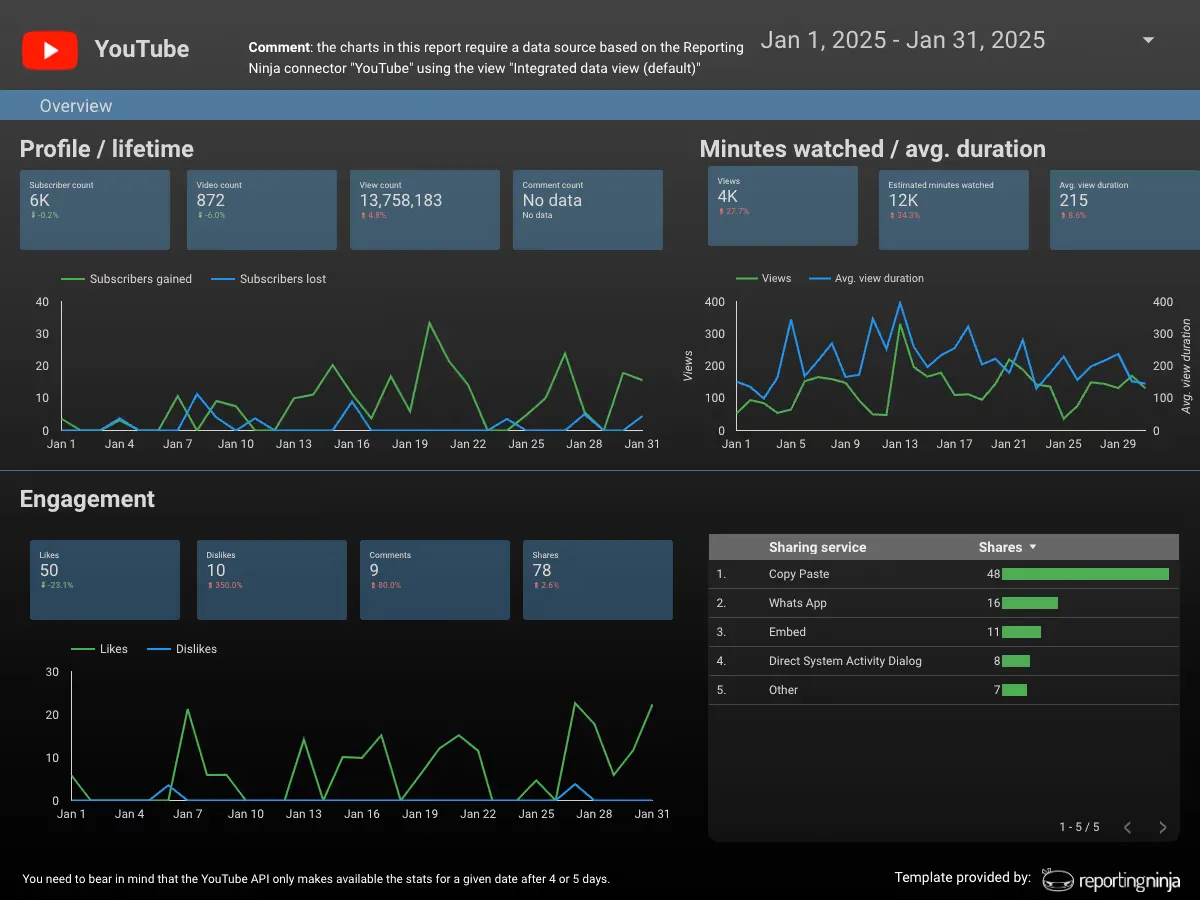 Awareness dashboards focus on reach, impressions, and follower growth. They’re essential when campaigns are designed to increase visibility rather than drive conversions. For example, using a YouTube template, agencies can present video views and subscriber growth in a format that proves the brand is building recognition.