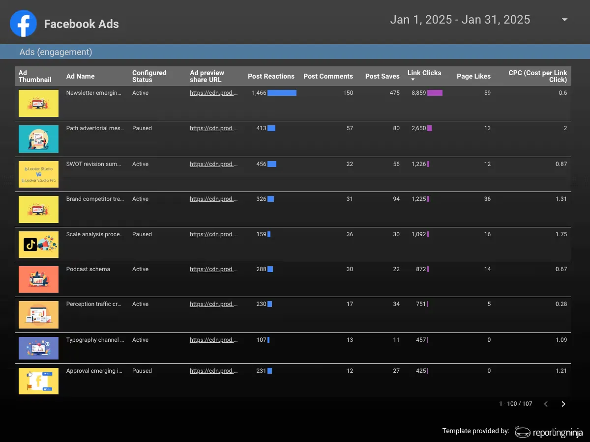 An agency might use a Facebook Ads template to compare campaign performance and reveal which ads generated the best cost per conversion. This makes it easier to optimize spend mid-campaign and demonstrate that ad investments are paying off.