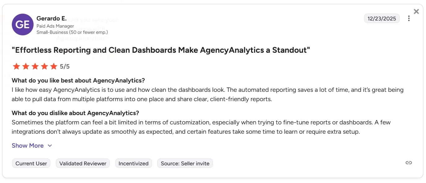 AgencyAnalytics es a menudo elogiada por su facilidad de uso y sus paneles limpios y fáciles de usar para el cliente. A revisor de G2 señaló que los informes automatizados ahorran tiempo y facilitan la combinación de datos de múltiples plataformas en informes claros.