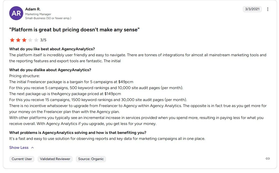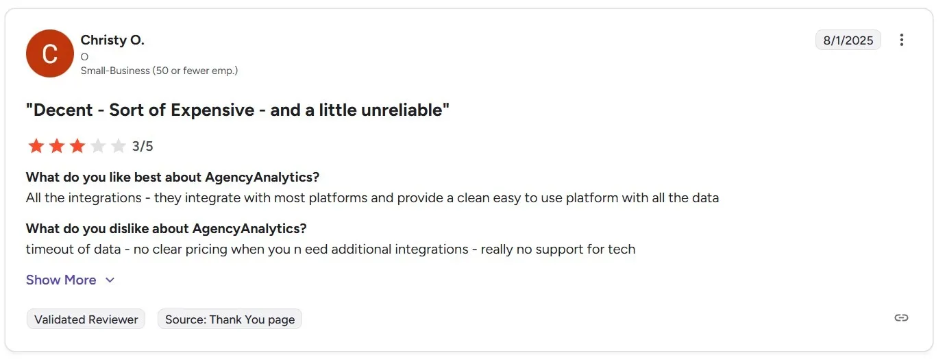 Algunas críticas negativas se centran en los precios y el valor más que en las características. Un revisor describió a AgencyAnalytics como decente pero caro y, en ocasiones, poco fiable.