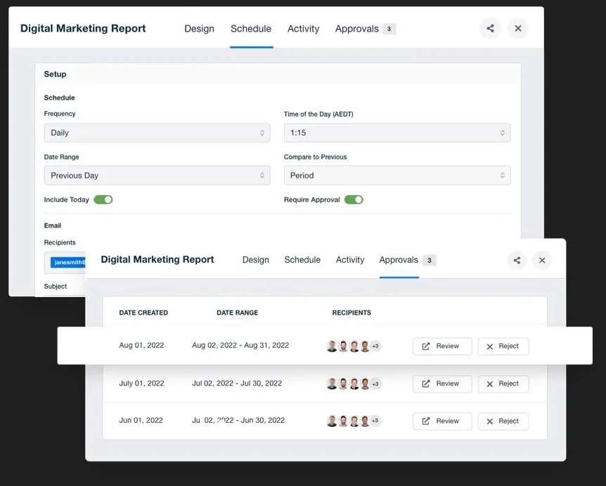 Los informes se pueden crear una vez y entregarse automáticamente según un cronograma periódico. Esto reduce el trabajo manual y mantiene la coherencia de los informes mensuales entre los clientes.