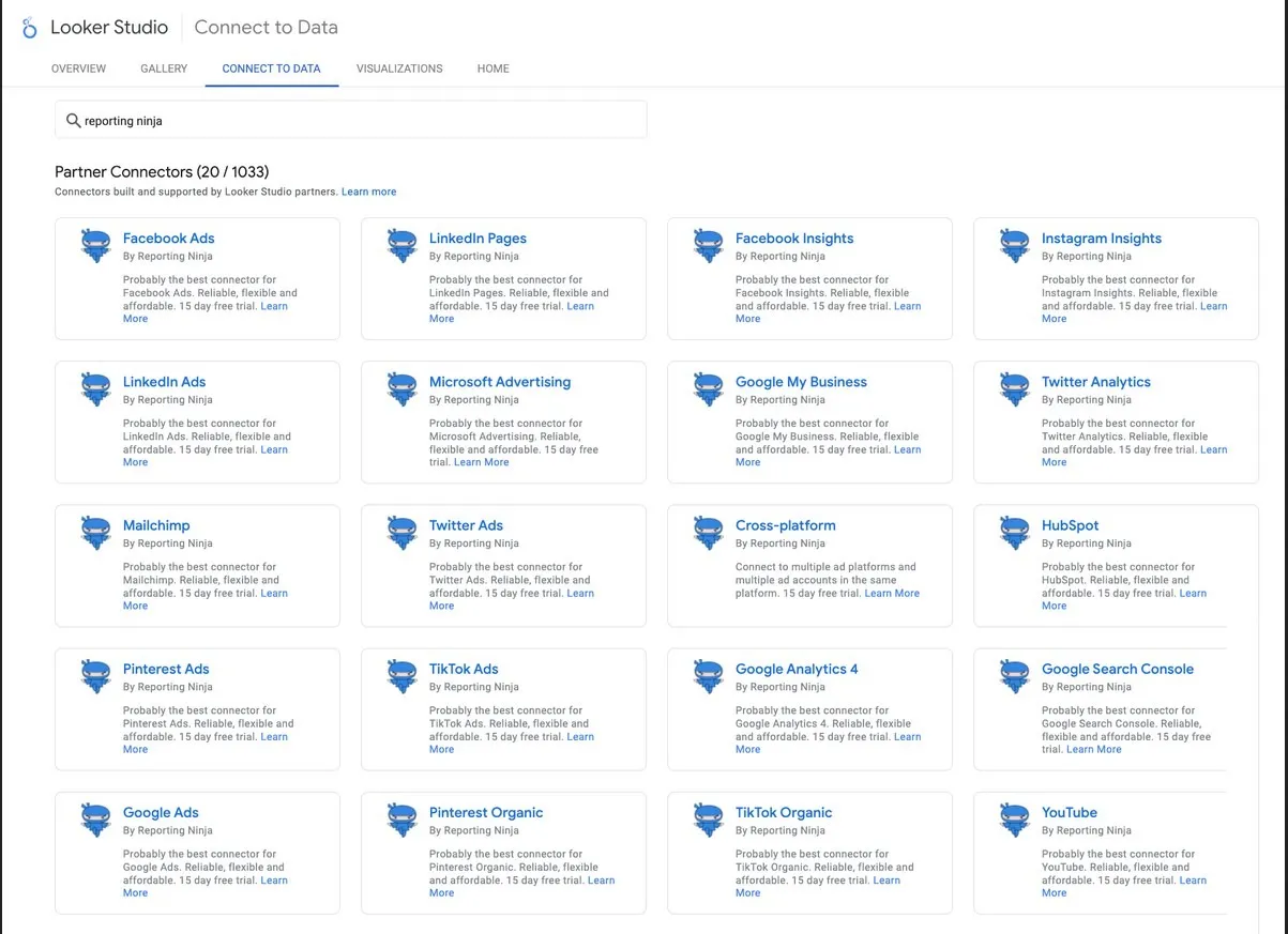 Reporting Ninja es una plataforma de informes basada en conectores para agencias que crean informes reutilizables en Looker Studio y Google Sheets y desean precios predecibles y basados en planes a medida que escalan.