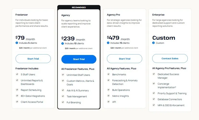 Muchas herramientas de elaboración de informes parecen asequibles al principio, pero se vuelven más difíciles de justificar una vez que añades más clientes, más cuentas o más usuarios. Antes de elegir, asigne los precios a la forma en que crece su agencia, de modo que no se vea obligado a cambiar de herramienta más adelante.