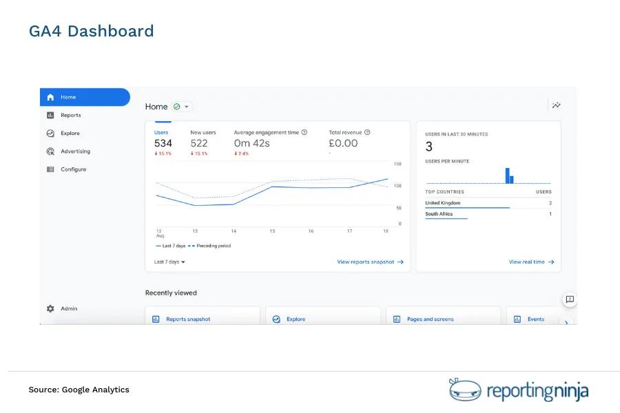 Reporting Ninja es un servicio de informes y análisis basado en la web que se conecta a tu cuenta de GA y genera informes atractivos y personalizados que son fáciles de entender.