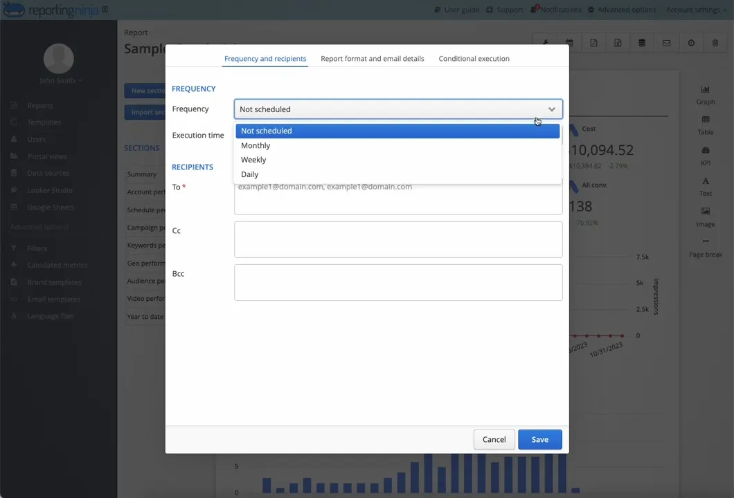 Las exportaciones manuales, la limpieza de hojas de cálculo y el formateo consumen mucho tiempo. La herramienta adecuada debería automatizar el ciclo de elaboración de informes, desde la obtención de los datos hasta el formateo y la entrega.